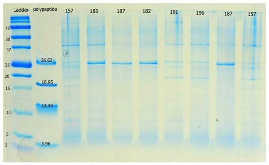 The proteomic profile of extracellular products of L. plantarum strains isolated from silages on 15% Tricine-SDS-PAGE gel. Chitinase bands in the 20 kDa range are visible in samples 191 and 196. Sample 157 is not included in this study. Precision Plus ProteinTM Dual Xtra Standards was used as the peptide standard. Polypeptide Molecular Weight StandardsTM represents insulin b chain (3.96 kDa), α-lactalbumin (14.437 kDa), myoglobin (16.95 kDa) and triosephosphate isomerase (26.62 kDa).