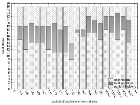 The antifungal activity of twenty strains belonging to L. plantarum was tested against 25 strains of yeast contaminants. The overlay method on artificial media represented the optimal in vitro conditions for interacting organisms, lactobacilli, and yeast. In overlay assay, the inhibitory effect against yeast varied significantly among L. plantarum strains (Figure 2, Table 7) and yeast strains. The numbers of non-inhibited, partially inhibited, and fully inhibited yeast strains are presented in Figure 2. The results show that the number of fully inhibited yeast strains was highest for L. plantarum strains isolated from sourdough (3018 and K19-3), silage (196), and cheese-wild types (L16, L24). The strain L16 inhibited eight yeast strains which is a maximal number of total inhibitions. The strains originating from raw milk proved rather partial inhibitions against the yeast inhibited and less rate of total inhibition. Strain CCDM 384 weakly suppressed yeast growth on artificial media, reflected by the high number of low-indexed inhibitions (Figure 2). This strain isolated from milk can partially inhibit a broad spectrum of yeast strains at a low level.