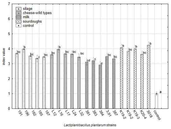 The variability in the antifungal effect against 25 yeast strains among L. plantarum strains from different origins based on index scale values from the overlay method. The data represent the means and SEM (ANOVA, Statistica v. 12, Post Hoc Tukey’s HSD Test). The index letter indicates significant differences. Significant at α ≤ 0.05.