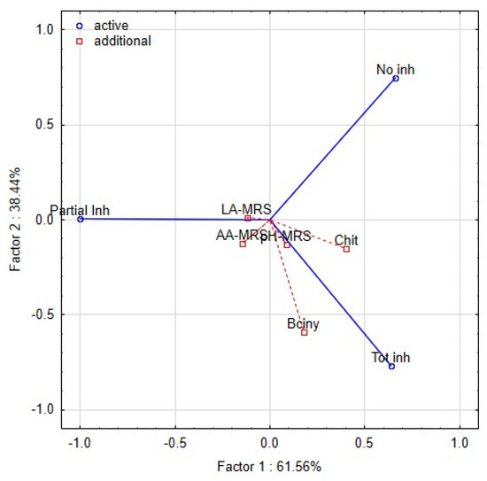 Data for physicochemical parameters were subjected to statistical analysis using ANOVA with a factorial design in Statistica Software v 12.0 (StatSoft, Tulsa, OK, USA). Significant differences among the tested groups were determined using Tukey’s HSD test at significance p ≤ 0.05. Variability in the antifungal effect based on index scale values was analysed by ANOVA with a factorial design, Statistica Software v 12.0 (StatSoft Europe, Hamburg, Germany). Index values were first log-transformed and presented as the mean with standard error of the means (s.e.m.) because of discrepancy of sample’s means [17,36]. Significant differences among the tested groups were determined using Tukey’s HSD test at significance p ≤ 0.05. Analysis of covariance (ANCOVA) was used to compare the combinatory effect of functional traits of lactobacilli (organic acids, pH, bacteriocin genes, and chitinase genes) on the variability in the antifungal effect. Parameter values were first log-transformed. The significance was tested at p ≤ 0.05 (post hoc Tukey’s HSD Test). The antifungal effects of L. plantarum strains on artificial media were divided into three categories: i.e., total inhibition, inhibition, and no inhibition. The effects were first summarised by using principal component analysis (PCA) using their correlation matrix. The functional traits were converted to a log-transformed dataset to summarise the multiplicative changes.