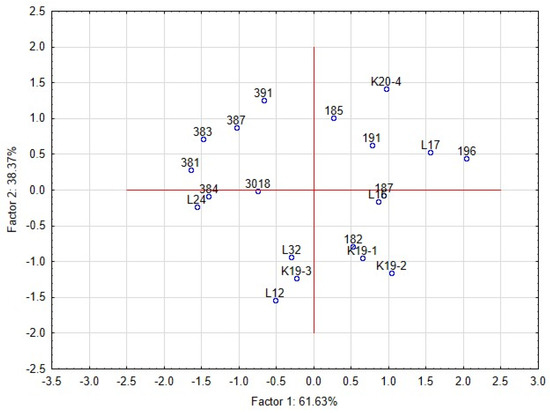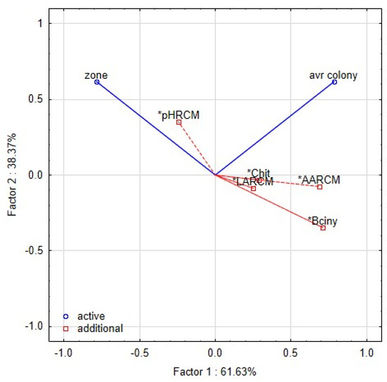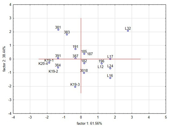 The PCA analyses were used to relate the yeast growth with characteristics of L. plantarum strains in RSM matrix (Figure 7). Inhibitory zones were observed in only a few combinations of lactobacilli and yeast strains. The proteolytic activity of yeast strain can also induce the clearing zone; thus, the comparison with the control variant is necessary. The first two components represented 99.9% variability. The first component explained 61.63% of the variability. The growth of yeast colonies was negatively correlated with the production of organic acids and bioactive proteins, and peptides. The second component demonstrated 38.37% of the variability and was positively correlated with the pH of RSM. The strains of L. plantarum in the scatter plot of PCA (Figure 8) are clustered according to their inhibitory effect against the yeast. The strains in the bottom left corner (L12, L32, L24, K19-3, 3018) represent the most effective strains. They are positively correlated with bacteriocins and organic acids, whereas the strains in the upper left corner are correlated with pH value and the occurrence of the zone. The antifungal effect of strains from sourdoughs, 3018 and K19-3, was the most effective on artificial and RSM-based medium. Besides the bacteriocins and chitinase profile, strain 3018 produced the lactic acid in MRS and RSM at the highest stable amount to compare the rest of the strains. Thus, concerning medical research on C. albicans [10], the intensive production of lactic acid can also support chitinase’s role in antifungal action.
