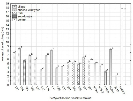 The differences in average sizes (mm) of yeast colonies growing on media with reconstituted milk and lactobacilli strains included in groups of origin (Factorial ANOVA, Statistica Software v. 12, Post Hoc Tukey’s HSD Test). The bars represent means and s.e.m. The index letter indicates significant differences. Significant at α ≤ 0.05.