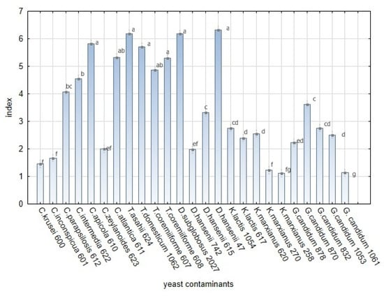 The sensitivity of yeast strains to L. plantarum strains in in vitro overlay tests. The bars represent the means of index value and SEM. F(24, 1050) = 400.009; p ≤ 0.00 E ≤ 0.05 (Factorial ANOVA, Statistica Software v. 12, Post Hoc Tukey’s HSD Test). The index letter indicates significant differences. Significant at α ≤ 0.05.