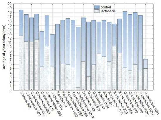 The comparison of the average sizes (mm) of the yeast colonies growing on malt extract agar supplemented with reconstituted milk with L. plantarum strains in and control variants without L. plantarum. The dotted bars represent the average of the yeast colony, blue part represents the control variant without lactobacilli.