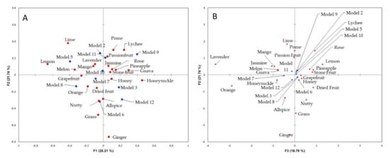The strong association of lemon aroma with model 9 was also unexpected, as lemon aroma is associated with limonene [49]. Limonene was not used in this study. Linalool is known to be a major component of lemon and orange juices [50], but is not considered to be a main driver of these aromas. Additionally, α-terpineol is considered to draw from flavors to aged lemon and citrus products; it is a degradation product of linalool [51]. Based on this information from lemon and orange products, it was a surprise to see such a strong lemon aroma association with combinations of the used terpenes. Although lemon was also noted in models 6 and 8, all three models have different rose oxide enantiomer ratios and concentrations of linalool and α-terpineol. No clear trend or explanation can be seen, and this association should be studied further.