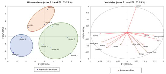 Differences were found in the model wines with the first two variates explained 53.25% of the total variance (Figure 2). A third dimension was not included, since it did not greatly increase the amount of total variance (only explained 15.42% more) and did not elucidate any additional groupings/separation of models. The wine models were classified into 3 clusters using agglomerative hierarchical clustering (AHC) (Supplementary Figure S1. Cluster 1 included models 3 and 10, and was characterized by pome, stone fruit, melon, and grapefruit descriptors. The second cluster included models 6, 8 and 9, and was characterized by lemon aroma. The third cluster included models 2, 5, 7, 11 and 12, and was characterized by lychee, honey, honeysuckle, rose, dried fruit, ginger, orange, and tropical fruit aromas.