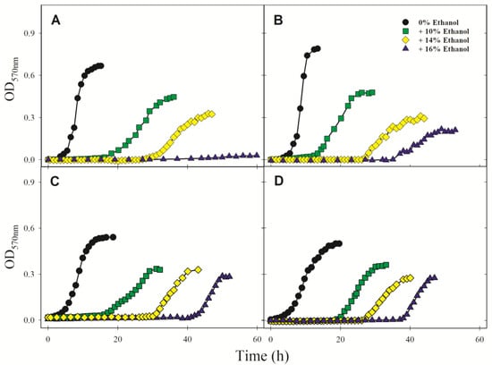 Yeast cells were pregrown overnight in 3 mL of YP-20 g/L sucrose, and 1:100 dilutions of these precultures were used to inoculate 100 μL of YP-20 g/L sucrose medium containing different concentrations of ethanol (10–16%, w/v) in 96-well plates in a TECAN Infinite® M200 Pro microplate reader (Tecan Group Ltd., Grödig, Salzburg, Áustria) to determine the growth of the yeast strains at 28 °C. All wells in the plate were tightly sealed with AccuClear Sealing Film for qPCR (E & K Scientific, Santa Clara, CA, USA), and growth of each culture was monitored by measuring the OD570nm every 15–60 min, with high intensity orbital shaking between measurements. Under the conditions used (100 μL of medium in 96-well plates), the maximum OD570nm measured when the cells reached the stationary phase of growth was 0.8–0.9 [37]. The yeast growth data in the presence of different ethanol concentrations was analyzed with the PRECOG software [43] to extract the fitness components affected by the ethanol stress in the different yeast strains, including the length of the lag phase (in h), growth rate (doubling time, in h), and growth efficiency (ΔOD570nm from the beginning to the stationary phase of growth).