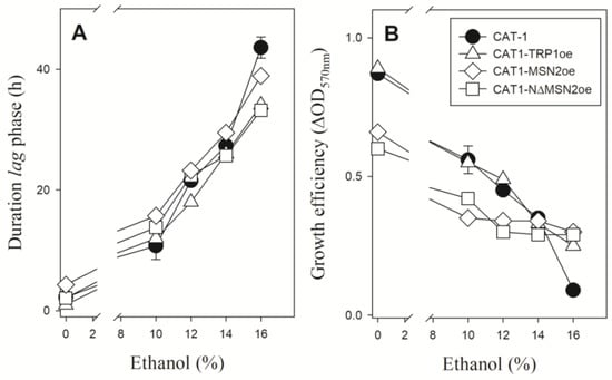 The CAT1-TRP1oe strain had its ethanol tolerance improved (Figure 1B), as shown by a shorter lag phase (~34 h, Figure 2A) and improved growth efficiency (Figure 2B) in the presence of 16% ethanol, with a ΔOD570nm that corresponds to one third of the value obtained in the absence of ethanol. Similar results of improved growth in the presence of 16% ethanol, with a shorter lag phase (Figure 1C,D and Figure 2A) and improved growth efficiency (Figure 1C,D and Figure 2B), were obtained with the CAT1-MSN2oe and CAT1-NΔMSN2oe strains when compared to strain CAT-1, although it should be noted that the overexpression of the MSN2 and NΔ(1-153)MSN2 genes reduced the growth efficiency of the industrial strain at lower ethanol concentrations, or even in the absence of ethanol (Figure 1C,D and Figure 2B).