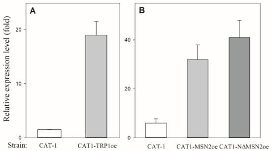 The results shown above indicate that the industrial CAT-1 strain is clearly more resistant to the ethanol stress when compared to laboratory strains, which usually do not tolerate more than 8–10% ethanol (e.g., ref. [22,25,26]). Aiming at increasing the ethanol tolerance of the industrial strain, three strategies known to improve growth of laboratory strains in the presence of ethanol were tested with strain CAT-1: (i) overexpression of the TRP1 gene; (ii) overexpression of the MSN2 gene; (iii) overexpression of a N-terminal truncated MSN2 gene. Figure 3 shows that the genomic engineering approach employed (see Materials and Methods section), using a kanMX-PADH1 module to replace the promoters of the target genes, succeeded in the overexpression of the TRP1 (approximately 12-fold, Figure 3A) and MSN2 and NΔ(1-153)MSN2 genes (approximately five- and seven-fold, respectively, Figure 3B) when compared to the expression of these genes in strain CAT-1, as determined by qRT-PCR. It should be stressed that only one copy of the target genes had its promoter region modified, and the other copy present in the diploid genome of strain CAT-1 retained its original promoter region, as determined by diagnostic colony PCR with a different set of primers (data not shown).