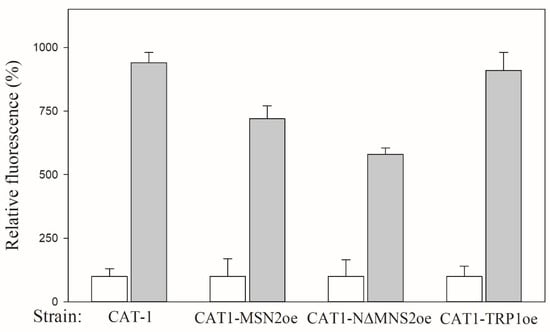 Given the relationship between ethanol and oxidative stress in S. cerevisiae [47], and the involvement of the MSN2 transcription factor in the expression of some ROS-degrading enzymes [48], we also determined the intracellular oxidation levels in the CAT-1, CAT1-TRP1oe, CAT1-MSN2oe, and CAT1-NΔMSN2oe strains trigged by exposure of the yeast cells to 20% (v/v) ethanol for 6 h. As can be seen in Figure 4, crude extracts from strain CAT-1 showed a nine-fold increase in fluorescence after exposure of the cells to the ethanol stress, indicating that ethanol induced intracellular ROS generation. Strain CAT1-TRP1oe also had high intracellular ROS generation trigged by the ethanol stress, not different from strain CAT-1. However, we observed a 24 to 38% decrease in the fluorescence when the cells of the CAT1-MNS2oe and CAT1-NΔMNS2oe strains were exposed to the ethanol stress, indicating that overexpression of MSN2, and particularly the truncated NΔ(1-153)MSN2 version of the gene, reduced the intracellular level of ROS in the presence of ethanol, probably due to the higher expression of antioxidant enzymes.