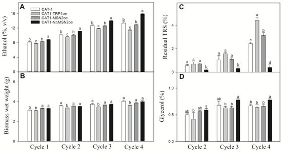 Fermentation performance under scaled-down and mimicked process resembling Brazilian sugarcane biorefineries by strains CAT-1 (white bars), CAT1-TRP1oe (gray bars), CAT1-MSN2oe (dark gray bars), and CAT1-NΔMSN2oe (black bars). (A) Ethanol produced during each cycle; (B) Wet biomass at the end of each cycle; (C) Residual TRS left at the three last cycles; (D) Glycerol produced during the three last cycles. Within each cycle, bars with different lowercase letters indicate significant differences between strains (p < 0.05).