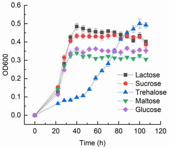 Growth analysis of M. phyllosphaerae LW106 strains. M. phyllosphaerae LW106 cells were grown in a 1/4 TSB medium containing 3 g/L of lactose, sucrose, trehalose, maltose, and glucose, respectively. Experiments were performed in triplicate, and the average values are shown.