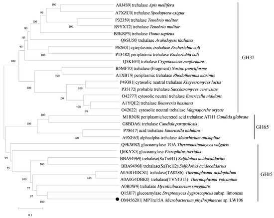 The phylogenetic relationships among GH37 and GH65 trehalases and relevant functional verified GH15 members were built. As shown in Figure 2, three major branches were formed. GH37 enzymes including trehalases from bacteria, yeasts, insects, algae, plants, and animals formed one branch, GH65 enzymes, which include acidic trehalases and periplasmic trehalose from fungi, were clustered in the same branch, and GH15 enzymes, which include MpTre15A, trehalase from Mycobacterium smegmatis, and archaeal trehalases from Sulfolobus acidocaldarius, Thermoplasma volcanium, and Thermoplasma acidophilum together with several glucoamylases (GAs) of different origin, were clustered in one branch.