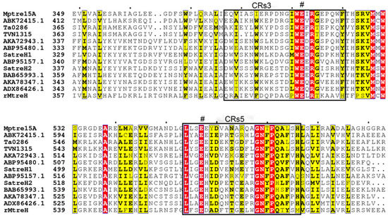 Multiple sequence alignments of M. phyllosphaerae trehalase partial conserved regions with relevant GH15 family trehalases. The sequences aligned are the following: ABK72415.1, Mycobacterium smegmatis MC2 155; LC004405.1, Thermoplasma volcanium TVN1315; LC004406, Thermoplasma acidophilum Ta0286; LC330867, Sulfolobus acidocaldarius SaTreH2; LC330868, Sulfolobus acidocaldarius SaTreH1; ABP95480.1, Metallosphaera sedula DSM 5348; ABP95157.1, Metallosphaera sedula DSM 5348; BAB65993.1, Sulfolobus tokodaii str. 7; AKA78347.1, Saccharolobus solfataricus; ADX86426.1, Sulfolobus islandicus REY15A; AKA72943.1, Saccharolobus solfataricus; UHN91757.1, Microvirga sp. MC18 rMtreH. The number sign (#) denotes putative catalytic residues. Fully conserved amino acid residues and related amino acid residues are red and yellow, respectively. Boxes show two highly conserved regions, conserved regions 3 (CRs3) and conserved regions 5 (CRs5).