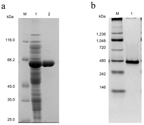 SDS-PAGE (a) and Native-PAGE (b) analysis of the purified proteins: (a) Lane M, molecular size marker (Unstained Protein Molecular Weight Marker: 116, 66.2, 45, 35, 25 kDa); lane 1, crude enzyme; lane 2, purified MpTre15A after Ni-IDA column; (b) Lane M, molecular size marker (Unstained Protein Molecular Weight Marker: 1234, 1048, 720, 480, 242, 146 kDa); lane 1, purified MpTre15A.