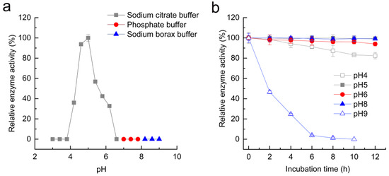 The influences of pH on MpTre15A activity are illustrated in Figure 5a. The trehalose-hydrolyzing activity of MpTre15A was maximal at pH 5.0. MpTre15A was active within a narrow pH range from 4.4 to 6.2. MpTre15A exhibited more than half of its maximal activity at pH between 4.8 and 5.4 but lost its activity greatly at pH below 4.4 and above 6.2. The pH stability of MpTre15A was also investigated (Figure 5b). MpTre15A retained over 80% of its maximum activity after 12 h treatment at 4 °C and a pH of 4.0, 5.0, 6.0, and 8.0. However, the residual activity of MpTre15A decreased to less than 30% after 4 h treatment at pH 9.0.