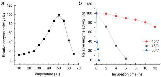 Effects of temperature on MpTre15A activity (a), and thermo-stability (b): (a) the activities of MpTre15A were measured at various temperatures (10 to 65 °C) in 100 mM citrate buffer (pH 5.0); (b) MpTre15A were incubated at various temperatures (40, 45, and 50 °C) for 60 min, and the remaining activities of MpTre15A were measured at 50 °C in 100 mM citrate buffer (pH 5.0). The initial activities without heat treatment were set as 100% with a specific activity of 62.5 U/mg. Experiments were performed in triplicate, and the average values are shown.