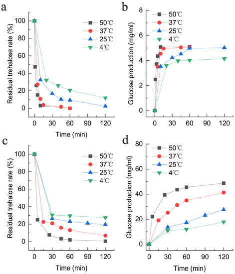 When 50 mg/mL trehalose was used as the substrate, trehalose was not completely degraded after incubated at 50 °C and 37 °C for up to 120 min, and the residual trehalose at 50 °C and 37 °C was 1.2% and 13.7% of the initial trehalose, respectively (Figure 7c). The trehalose hydrolysis rate at 25 °C and 4 °C was only 60.6% and 44.9% after 120 min of incubation, which is much lower than that at 50 °C and 37 °C. Correspondingly, the glucose production at 25 °C and 4 °C after 120 min was only 27.58 g/L and 17.80 g/L, respectively, both of which were significantly lower than those (48.78 g/L and 41.29 g/L, respectively) at 50 °C and 37 °C (Figure 7d). Approximately 39.9% of the total trehalose could still be detected after 6 h of incubation at 4 °C. In addition, compared with the trehalose conversion rate with an initial substrate concentration of 5 mg/mL at 4 °C and 25 °C, the trehalose conversion with an initial substrate concentration of 50 mg/mL at the same reaction temperature was significantly lower, which may be caused by inhibition effects of a high concentration of substrate or produced glucose.