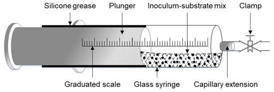The BMP of the test components was conducted via the HBT as per VDI-4630 standards [36]. In such a fermentation test, a 100 mL calibrated glass syringe, with a plunger and a capillary extension at either end, acts as a bioreactor, as shown in Figure 1.