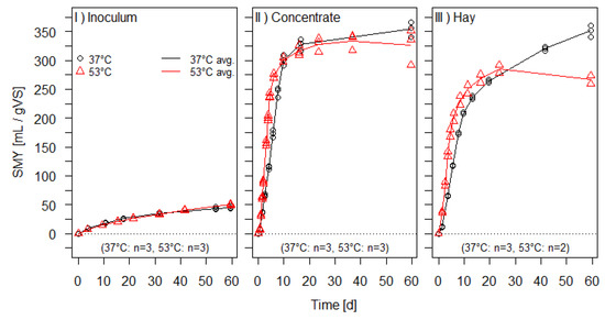 Figure 2 represents the SMY for the inocula, feed-concentrate, and hay utilized as zero samples and standard substrates in the current study at 37 °C and 53 °C, respectively. The expected amount of the gas yields establishes hay and feed-concentrate as ideal candidates for standard substrates to assess the quality and soundness of the inoculum and digestion process, respectively [42]. The methane yields from the test components and the standard substrates were acquired by subtracting the methane yields of the zero samples from the inoculum-substrate mix assays’ gas yields.
