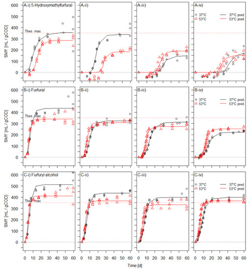 Measured specific methane yields for (A) 5-Hydroxymethylfurfural, (B) furfural, and (C) furfuryl alcohol from their per batch-test added amounts of (i) 0.1 gCOD, (ii) 0.2 gCOD, (iii) 0.3 gCOD, and (iv) 0.4 gCOD under mesophilic and thermophilic conditions, along with the fitted modified Gompertz function (n = 3 for all the test concentrations of the furanic compounds at 37 °C and 53 °C).