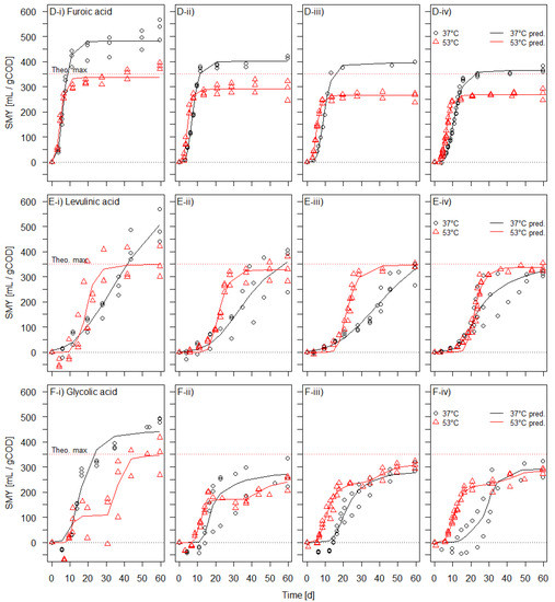 Measured specific methane yields for (D) furoic acid, (E) levulinic acid, and (F) glycolic acid from their per batch-test added amounts of (i) 0.1 gCOD, (ii) 0.2 gCOD, (iii) 0.3 gCOD, and (iv) 0.4 gCOD under mesophilic and thermophilic conditions, along with the fitted modified Gompertz functions (n = 3 for all test concentrations of the acidic compounds at 37 °C and 53 °C, except n = 2 for 0.3 gCOD levulinic acid and 0.4 gCOD glycolic acid at 53 °C and 37 °C, respectively. n = 1 for 0.3 gCOD furoic acid at 37 °C).