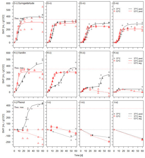 Measured specific methane yields for (G) syringaldehyde, (H) vanillin, and (I) phenol from their per batch-test added amounts of (i) 0.1 gCOD, (ii) 0.2 gCOD, (iii) 0.3 gCOD, and (iv) 0.4 gCOD under mesophilic and thermophilic conditions, along with the fitted modified Gompertz functions (n = 3 for all the test concentrations of the phenolic compounds at 37 °C and 53 °C, except n = 2 for 0.4 gCOD Syringaldehyde at 37 °C and 0.4 gCOD Vanillin at 37 °C and 53 °C. The Gompertz functions are not fitted to the data with negative mean measured methane yields).