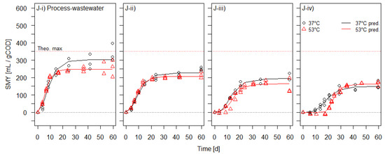Measured specific methane yields for the process-wastewater from its per batch-test added amounts of (i) 0.1 gCOD, (ii) 0.2 gCOD, (iii) 0.3 gCOD, and (iv) 0.4 gCOD under mesophilic and thermophilic conditions, along with the fitted modified Gompertz functions (n = 3 for all the test concentrations at 37 °C and 53 °C except n = 2 for 0.3 gCOD wastewater at 37 °C).