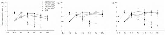 Growth behavior of CY3079 and MP3007 during pure and sequential culture. (A) Yeast concentration at 200 g L−1 initial sugar concentration; (B) yeast concentration at 290 g L−1 initial sugar concentration; (C) yeast concentration at 380 g L−1 initial sugar concentration. The solid circles represent the dynamic change of MP3007 when the M. pulcherrima inoculation amount is 106, and the inverted solid triangles represent the dynamic change of MP3007 when the M. pulcherrima inoculation amount is 107; the hollow circles represent the dynamic change of CY3079 when the M. pulcherrima inoculation amount is 106, the hollow triangles represents the dynamic change of CY3079 when the M. pulcherrima inoculation amount is 107, and the solid square represents the dynamic change of CY3079 in the control group.