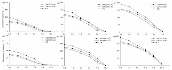 Dynamic changes of glucose or fructose during fermentation. (A,D), respectively, mean the dynamic changes of glucose and fructose in 200 g L−1 sugar content fermentation must; (B,E), respectively, mean the dynamic changes of glucose and fructose in 290 g L−1 sugar content fermentation must; (C,F) respectively mean the dynamic changes of glucose and fructose in 380 g L−1 sugar content fermentation must.