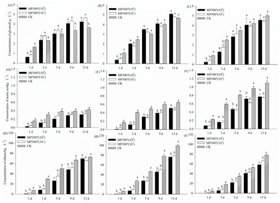 Dynamic changes of glycerol, acetic acid, and ethanol during fermentation. (A,D,G) respectively mean the dynamic changes of glycerol, acetic acid, and ethanol in 200 g L−1 sugar content fermentation must; (B,E,H), respectively, mean the dynamic changes of glycerol, acetic acid, and ethanol in 290 g L−1 sugar content fermentation must; (C,F,I), respectively, mean the dynamic changes of glycerol, acetic acid, and ethanol in 380 g L−1 sugar content fermentation must. Letter marks indicate significant differences (p < 0.05).