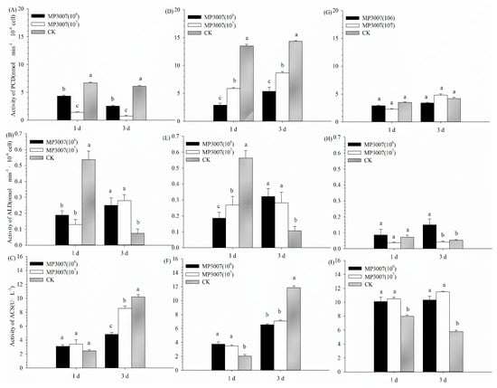 Compared with the other two enzymatic activities, the activity of ALD is the lowest in order of magnitude. It can then be observed that the ALD activity of the CK group is always higher than that of the mixed fermentation group on day one and reversed on day three (Figure 4B,E). However, the activities on days one and three are found to be very low at approximately 0.1 nmol·min−1·10−6 cells. Therefore, this phenomenon does not apply to H. Additionally, no significant difference was observed between the different inocula of MP3007 in Figure 4B,E,H, except that the lower inoculation group in Figure 4H was higher than the other groups on day three.