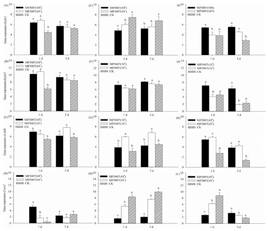 It was observed that both the initial sugar concentration and MP3007 affected the four CY3079 genes in Figure 5. When the initial sugar concentration was 200 g L−1, the trends of pdc1 and pdc5 were very similar. The expression level of the mixed fermentation group was significantly higher than that of the CK group on 1 d, and there was no significant difference between the groups on 3 d (Figure 5A,B). When the initial sugar concentration reached 290 g L−1, the pdc1 expression was inhibited in the mixed fermentation group compared with the CK group, and it was observed that the high inoculation of MP3007 at the one-day time point would weaken the inhibitory effect. pdc5 expression exhibited a stable state in F. When the initial sugar concentration increased to 380 g L−1, I and J showed that the lower inoculum of MP3007 could induce the expression of pdc1 and pdc5 genes, while there was no significant difference between the group with higher inoculation of MP3007 and the CK group. Ald6 was induced at the 1 d time point of C and K, but the performance of C and K differed at the 3 d time point. The group with higher inoculation amount in C continued to induce ald6 expression, while the lower inoculation group differed insignificantly from the CK group; the three days in K were similar to 1 d but showed a downward trend. The effect of higher initial sugar concentration on acs2 on 1 d was similar (Figure 5H,L), the acs2 expression was suppressed in the mixed fermentation group compared with the CK group, and the increase in MP3007 inoculation attenuated the level of inhibition. The difference between H and L is in the 3 d period. The above rules were maintained, and the acs2 expression had a slight upward trend in H, but there was no difference between the groups in L. The performance of the 1 d period when the initial sugar concentration is 200 g L−1 (Figure 5D) is the opposite of other high sugar concentrations. It showed that with the induction of the acs2 expression in the mixed fermentation group, the higher the MP3007 inoculation concentration, and the lower the induction level.