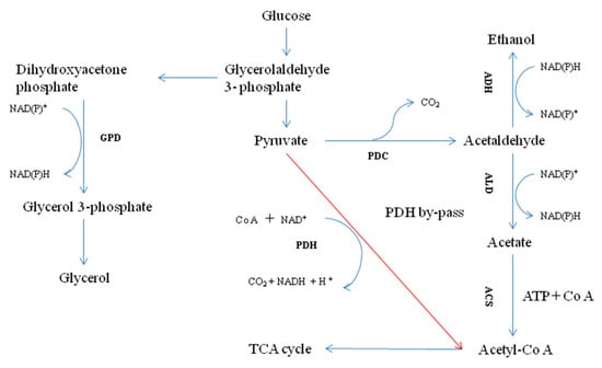 Schematic representation of the main reactions and enzymes involved in PDH by-pass metabolism pathway in yeast.