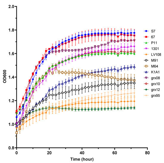 The growth of the 12 strains in this study in SHLE is shown in Figure 1. Overall, Lactobacillus plantarum (S7, 67 and P11) grew better. There were also differences in strains within the same species. For example, the hsryfm1301 and grx10 strains of Lactobacillus rhamnosus grew better whereas the LV108 strain grew poorly. The strain grx08 in Lactobacillus fermentum grew better whereas M91 grew worse. Finally, five strains—S7, 67, grx10, 1301 and grx08—were selected for further study.