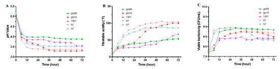Changes in pH value (A), titratable acidity (B) and viable bacteria count (C) of SHLE fermented by different LAB. Values are expressed as the mean ± standard deviation of replicate experiments (n = 3).