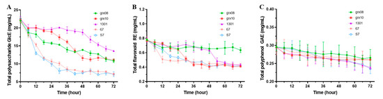 The active substances showed a gradual decreasing trend during the fermentation of lactic acid bacteria (Figure 3). Polysaccharides were the most utilized or influenced by the lactic acid bacteria (Figure 3A) and polyphenols were the least utilized (Figure 3C). In the comparison of different species/strains, it could be seen that L. plantarum (S7 and 67) consumed more polysaccharides and flavonoids (Figure 3A,B). L. rhamnosus hsryfm1301 had the least utilization of polysaccharides (Figure 3A), but had a great influence on the utilization of polyphenols (Figure 3C). L. fermentum grx08 had the least effect on the utilization of flavonoids (Figure 3B).
