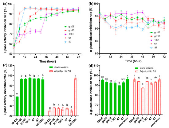 LAB fermentation significantly increased the inhibition rate of the pancreatic lipase activity of SHLE (p < 0.05) and finally stabilized at approximately 93% (Figure 4a). Conversely, fermentation resulted in a slightly lower inhibition of the α-glucosidase activity of SHLE (Figure 4b). Figure 4c shows that the five types of LAB fermentation for 72 h increased the lipase activity inhibition rate of SHLE to the inhibition level of 0.5 mg/mL orlistat (positive control). However, the α-glucosidase activity inhibition rate slightly decreased after fermentation (Figure 4d). The reduction in L. fermentum grx08 and L. plantarum S7 fermentation was, however, not significant (p > 0.05).