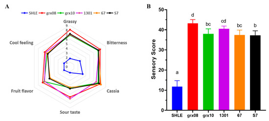 Effects of fermentation with different lactic acid bacteria on SHLE flavor. (A) Sensory scoring radar chart and (B) total score of sensory evaluation. Values are expressed as the mean ± standard deviation of replicate experiments (n = 10). Different letters indicate a significant difference (p < 0.05).