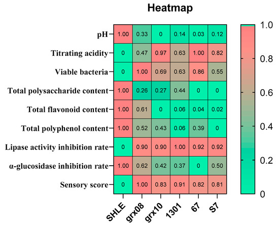 Heatmap analysis of the substance content, the activity of inhibiting energy-related enzymes and the sensory flavor of SHLE by the fermentation of different strains. The data were processed by min–max normalization with the formula (x − min)/(max − min). The changes in color and shade from green to red represent the magnitude of the value from 0 to 1.