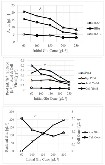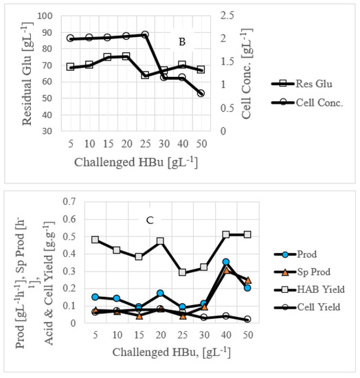 Glucose inhibition on C. tyrobutyricum. (A) Production of acids at various glucose concentrations; (B) productivities, specific productivities, acid yield, and cell yield; (C) residual glucose and cell concentration. HAc—acetic acid; HBu—butyric acid; HAB—total acetic and butyric acids; Prod—productivity; Sp. Prod—specific productivity; Res Glu—residual glucose; cell conc—cell concentration.