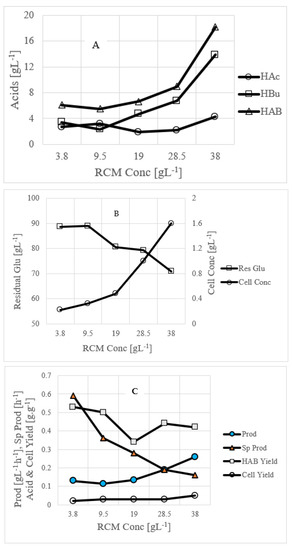 The abovementioned experiments used a standard RCM concentration of 38 g L−1, which is only cost-effective for laboratory studies. Hence, we attempted to lower the amount of the RCM by testing concentrations from 3.8 to 38.0 g L−1 (Figure 3A). Even lowering the RCM concentration from 38 to 28.5 g∙L−1 significantly lowered the fermentation yield. At the lowest tested RCM concentration (3.80 g L−1), the maximum achieved concentrations were only 3.41 g L−1 of butyric acid and 2.71 g L−1 of acetic acid. The residual glucose and cell concentrations are shown in Figure 3B. Residual glucose concentrations were from 70.9 to 88.6 g L−1. This experiment demonstrated that a reduction in the RCM concentration was not beneficial for this fermentation. In these experiments, butyric acid productivities were 0.13 to 0.26 g L−1 h−1 and specific productivities were 0.16–0.59 h−1. The total acid yield and cell yield were 0.34–0.53 and 0.02–0.05 g g−1, respectively (Figure 3C).