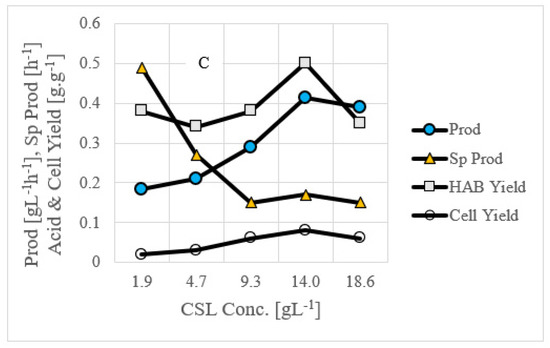 Since low RCM concentrations are not favorable for the production of high concentrations of butyric acid, we explored substituting CSL, which is a commercial source of nutrients widely used in the fermentation industry. CSL is manufactured as a co-product from condensed steep. It is favored by the industry because it is a rich source of nutrients and inexpensive. Two other evaluated commercial nutrient sources, trypticase soy broth (TSP) and P2 (a semi-defined medium commonly used for clostridium fermentations), were found to provide inferior results (data not shown) compared with the use of CSL. Between 1.90 and 18.6 g L−1 (dry weight) of CSL was added. At a CSL concentration of 18.6 g L−1, 3.86 g L−1 of acetic acid and 11.57 g L−1 of butyric acid were produced (Figure 4A). The final cell growth was 2.6 g L−1, which was higher than that obtained with the RCM. Residual glucose concentrations were from 54.9 to 80.7 g L−1 (Figure 4B). In this fermentation, the productivity ranged from 0.19 to 0.42 g L−1 h−1 and specific productivity ranged from 0.15 to 0.49 h−1. The total acid yields were from 0.34 to 0.50 g g−1, and cell yields were 0.02–0.08 g g−1 (Figure 4C). CSL is a rich source of degradable proteins, amino acids, peptides, trace elements, and other nutrients. It is anticipated that due to the abovementioned nutritive value, CSL resulted in successful butyric acid fermentation. The use of CSL has been reported as a cost-effective nutrient source for ethanol [24,25] and Bacillus subtilis [23] fermentations.