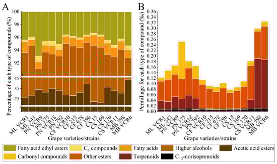 Proportions of various aroma substances in wine samples. (A) Percentage share of each type of aroma having high content. (B) Percentage of thousand points for some of the lower content aromas.