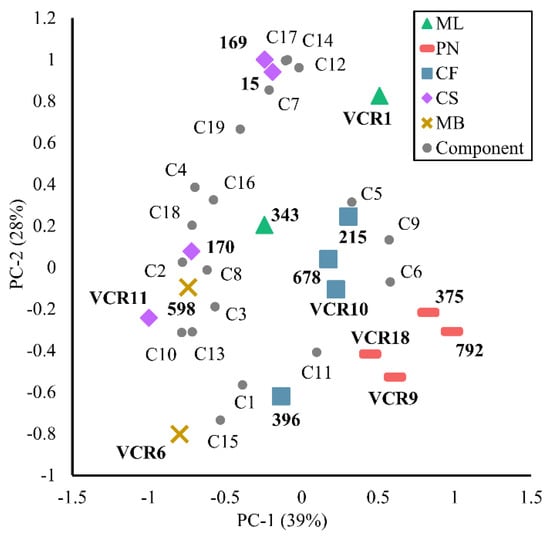 Loadings of fermented and varietal aroma compounds and the distribution of the wine samples in the first two PCs. C1: ethyl acetate; C2: isobutyl acetate; C3: ethyl butyrate; C4: isoamyl acetate; C5: isobutanol; C6: 1-butanol; C7: isoamyl alcohol; C8: ethyl caproate; C9: ethyl lactate; C10: ethyl octanoate; C11: decanal; C12: isobutyric acid; C13: ethyl decanoate; C14: isovaleric acid; C15: ethyl 9-decenoate; C16: hexyl alcohol; C17: 2-phenylethanol; C18: octanoic acid; C19: decanoic acid.
