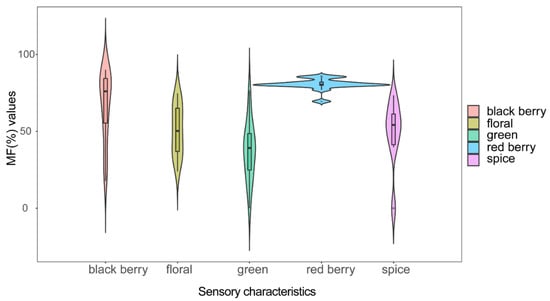 Violin plot showing the MF (%) values of sensory characteristics of the wine samples among various varieties and clones.