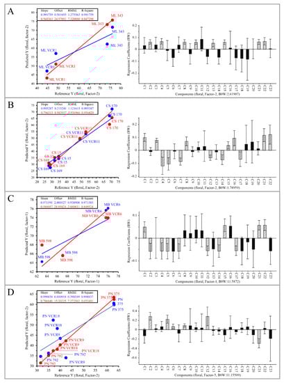 The analysis showed that Cabernet Sauvignon 170, Cabernet Sauvignon VCR11, and Malbec 598 had high contents of high-quality fermentation aroma components, mainly including fatty acids, fatty acid ethyl esters, and acetate, which accounted for the high-quality fruit flavors in the wines. The compositions and contents of the fermentation aromas of the wines from the four Pinot Noir clones were similar. Although the compounds responsible for the fermentation aromas of the wine samples from different clones of other varieties were similar, their contents varied widely. Among the four Cabernet Franc clones, Cabernet Franc 396 produced wines with higher levels of ethyl acetate, ethyl 9-decenoate, and decanal, which impart floral, cream, and cheese aromas []. The other three clones led to similar distributions of wine samples with higher levels of isobutanol, ethyl lactate, and 1-butanol, which provide aromas of pineapple, honey, butter, and caramel []. Among the different clones, Cabernet Sauvignon was found to be more dispersed. The distance between Cabernet Sauvignon 15 and Cabernet Sauvignon 169 was short, and the contents of isoamyl alcohol, isobutanol, isovaleric acid, and phenylethanol were higher; they produce aromas reminiscent of rose, bread, fermentation, grains, and sweet fruits []. Cabernet Sauvignon 170 had higher levels of isobutyl acetate, isoamyl acetate, ethyl caproate, capric acid, and caprylic acid, producing more sweet fruit, candied fruit, banana, and oil aromas []. Cabernet Sauvignon VCR11 had higher levels of ethyl caprylate and ethyl caprate, adding pleasant fruit flavors. The wine samples from the two Merlot clones were farther apart, with Merlot 343 having a higher content of isoamyl alcohol and more prominent fermented and grainy flavors, while Merlot VCR1 had a higher content of ethyl lactate and more creamy and buttery flavors. Malbec VCR6, which was rich in tropical fruit flavors, had higher contents of ethyl acetate and ethyl 9-decenoate. Malbec 598 had higher levels of isobutyl acetate and ethyl caprate, which resulted in banana, candied fruit, and coconut aromas. In summary, fermentation aromas contributed more to the sensory flavor of the wine samples than varietal aromas. Therefore, more volatiles belonging to the class of fermentation aromas were selected during the analysis using the PLSR model.
