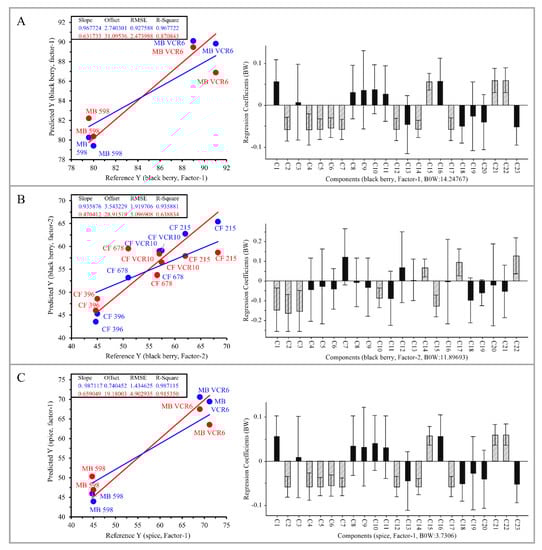 As shown in Figure 5C, ethyl 9-decenoate, hexyl alcohol, and (Z)-3-hexen-1-ol were positively correlated with spice aroma in Malbec, with correlation coefficients of 0.057, 0.059, and 0.059, respectively (Table S4). Combining the previous analyses for the floral (Figure 4C) and black berry aromas (Figure 5A) of Malbec, the results of the PLSR analysis for Malbec were found to be more consistent, and ethyl 9-decenoate, hexyl alcohol, and (Z)-3-hexen-1-ol were found to correlate positively with floral, black berry, and spice aroma characteristics, respectively.