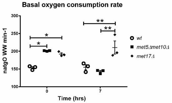 - Choi, K.-M.; Kim, S.; Kim, S.; Lee, H.M.; Kaya, A.; Chun, B.-H.; Lee, Y.K.; Park, T.-S.; Lee, C.-K.; Eyun, S.-I.; et al. Sulfate Assimilation Regulates Hydrogen Sulfide Production Independent of Lifespan and Reactive Oxygen Species Under Methionine Restriction Condition in Yeast. Aging 2019, 11, 4254–4273. [Google Scholar] [CrossRef] [PubMed]