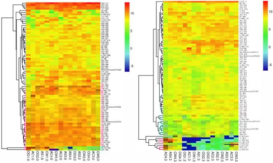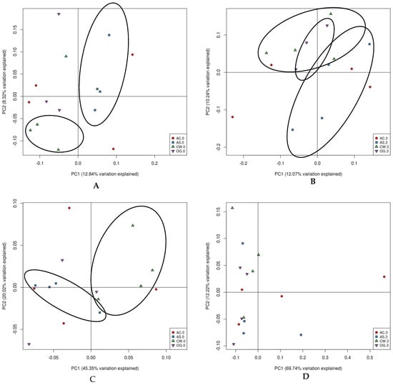 According to the specific species and species diversity of the samples, the unweighted-unifrac and weighted-unifrac distance matrix calculation methods were used for principal coordinate analysis (PCoA). As shown in Figure 4A, the microorganisms in the AS and CW groups were clustered and separated before feeding (0 h), and from Figure 4B, the CW, AS, and OG groups clustered and coincided after feeding (3 h). As shown in Figure 4C, the AS and CW groups clustered and separated from each other before feeding (0 h), whereas the other two groups were relatively dispersed. However, as observed in Figure 4D, the relative abundance of species in each group changed after feeding (3 h) compared to that before feeding (0 h) and gathered together; however, the distribution of the AC group was still scattered.